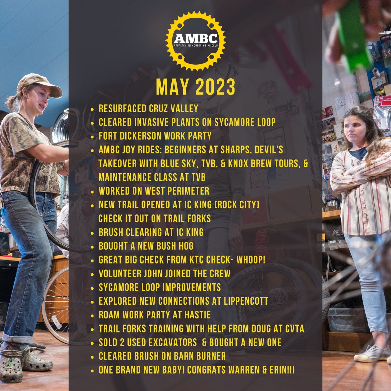 Wet Weather Reminders: Great options include: Baker Creek Bike Park, Marie Myers via Redbud Crest, Sharps Ridge, Loyston, Norris, and Big South Fork.