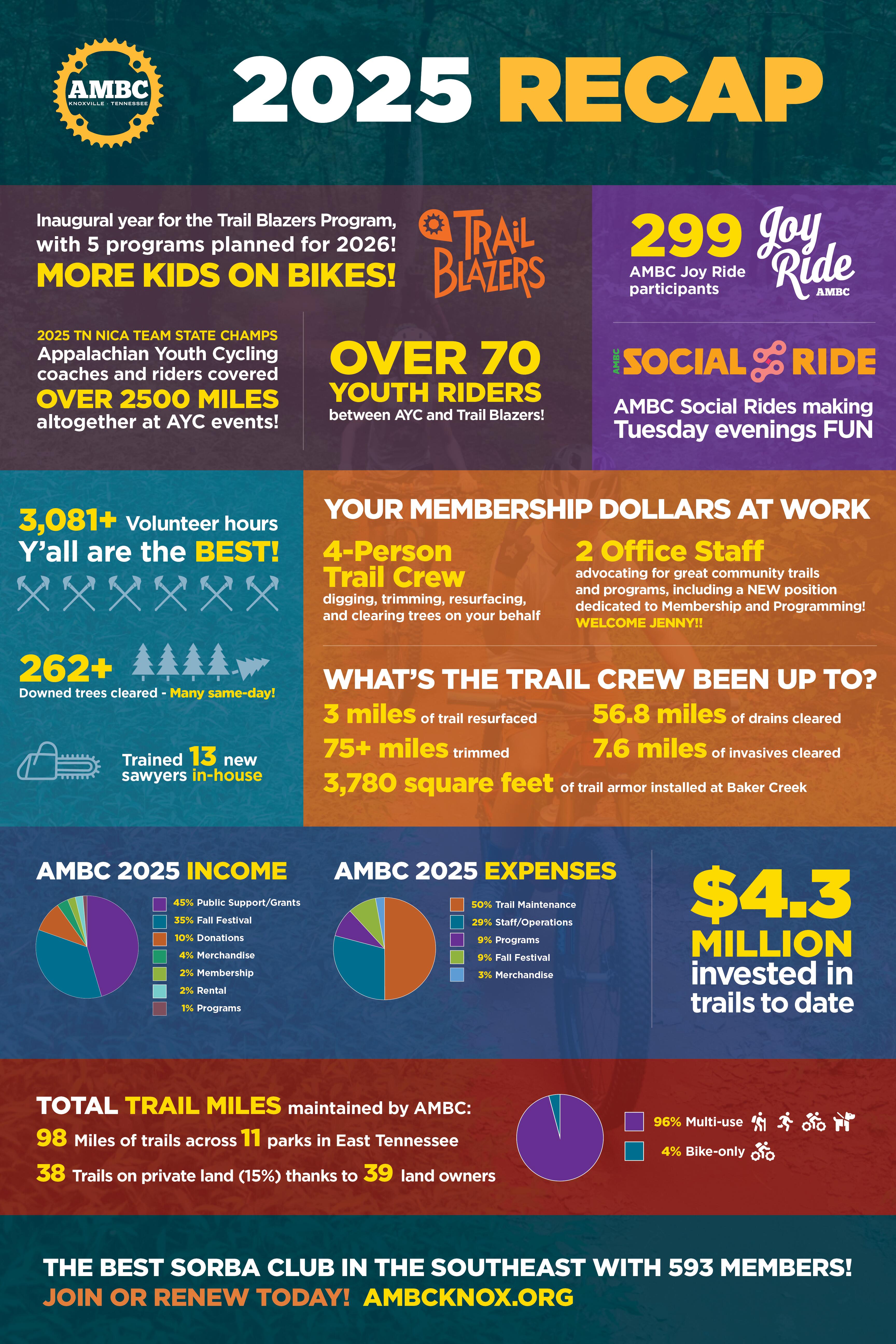 We’re so grateful for this past year — all the people we connected with, programs we led, trails we maintained — the list goes on. It’s been a big year as we’ve transitioned to SORBA membership, and we even added a team member (welcome, Jenny!) to AMBC.